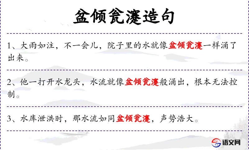 3. 【盆倾瓮瀽】 瀽:倒。盆瓮都倾倒过来。形容水、酒等液体急速下泻。