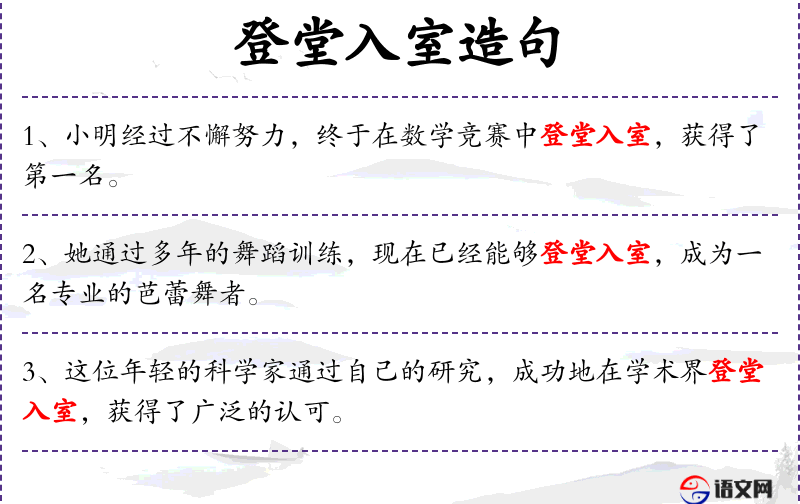 3. 【登堂入室】 堂、室:古代宫室,前面是堂,后面是室。登上厅堂,进入内室。比喻学问或技能从浅到深,达到很高的水平。