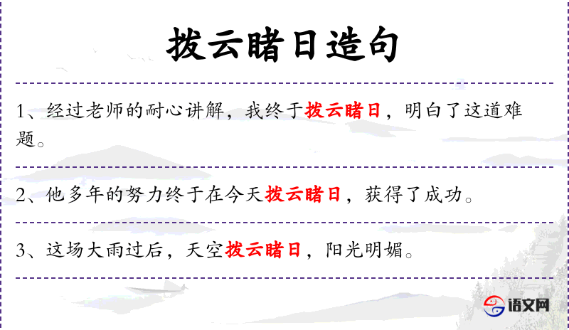 “拨云睹日”是一个成语,源自《晋书·陶侃传》,比喻消除困难,看到光明。这个成语在文化中常用来形容克服困难后的成功。