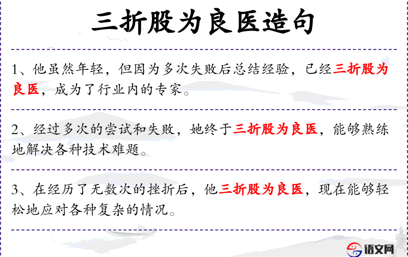 1. 【三折股为良医】 - 比喻对某事阅历多,富有经验,自能造诣精深。