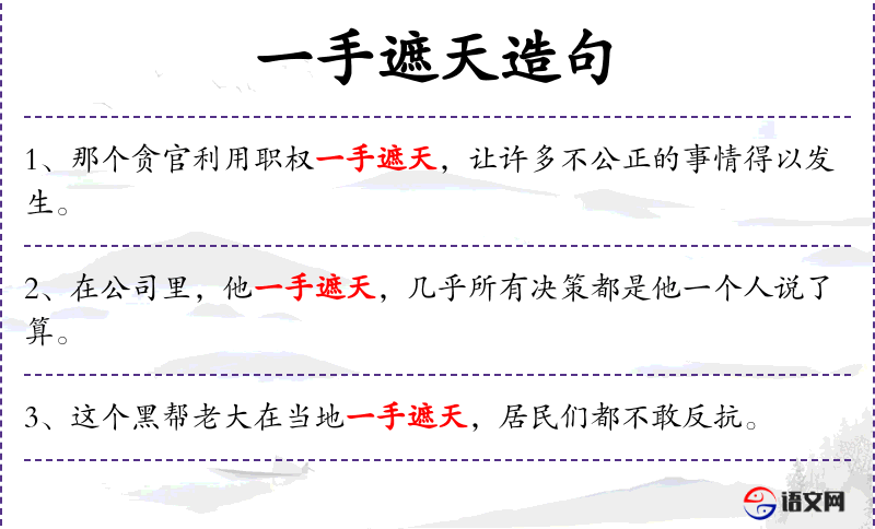 - 一手遮天:这个成语源自**古代,形象地描述了某人权力极大,能够控制一切的情况。
