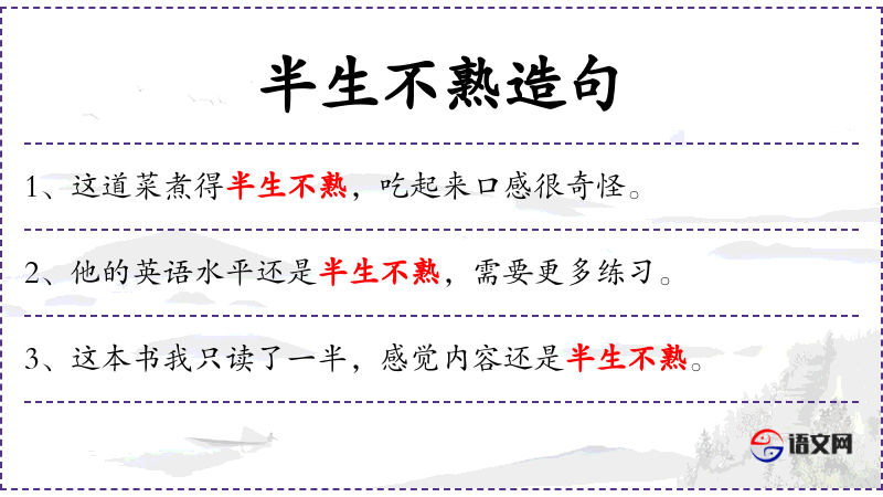 1. 【半生不熟】 没有完全成熟或未烹煮至可食用的程度。比喻不熟悉;不熟练。