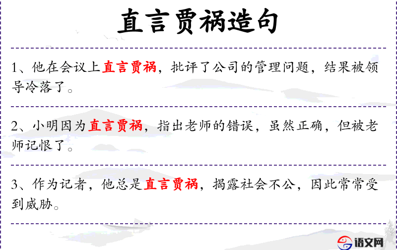 1. 【直言贾祸】 直:坦率、直爽;贾:买,引申为招致。指说话直率的人会惹祸。