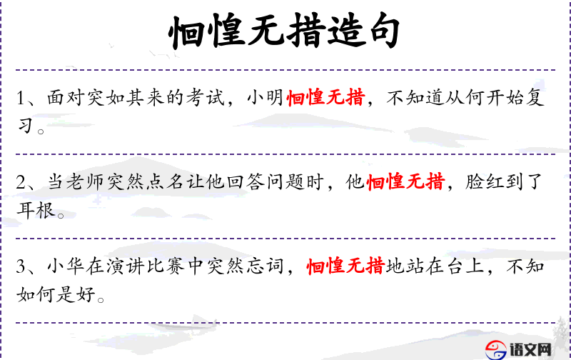 - 老师突然点名让他回答问题,他顿时恛惶无措,脸红得连耳根都红了。