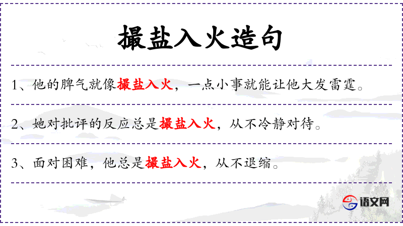 - 文化背景:在**文化中,“撮盐入火”是一个常用的比喻,用来形容事情的恶化或情绪的加剧。