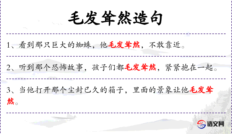 1. 【毛发耸然】 - 毛发竖起。极言惊骇、恐惧。同“毛发悚然”。