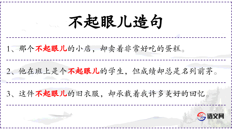 1. 【不起眼儿】 - 不值得重视;不引人注目:~的小人物。