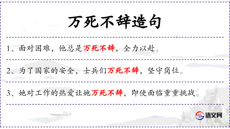 - 万死不辞:willing to die a thousand deaths without regret (形容极度勇敢和决心)