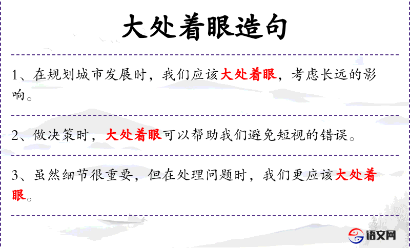 - 大处着眼:从宏观或整体的角度考虑问题。