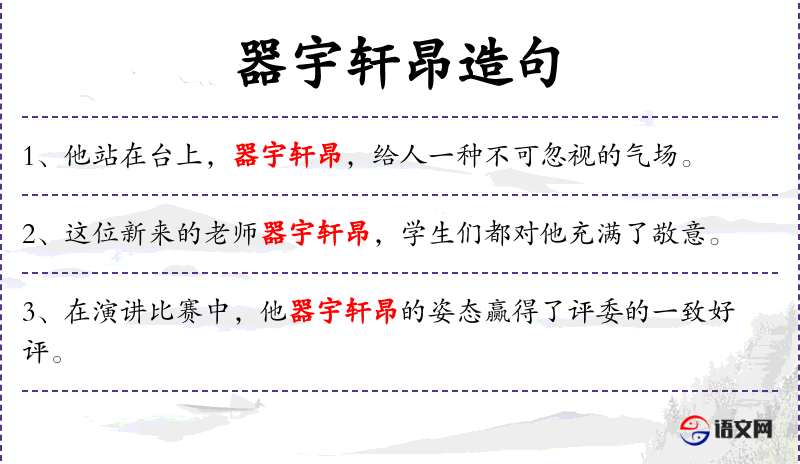 - 器宇轩昂:形容词,形容人仪表堂堂,气度不凡。