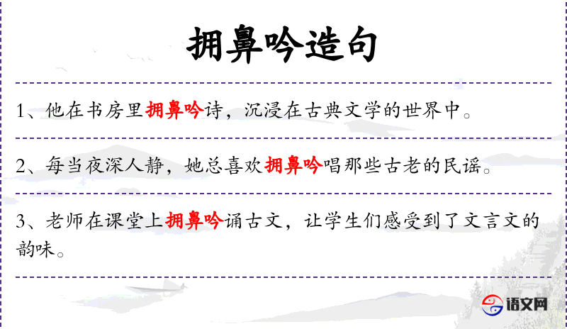 3. 【拥鼻吟】 用手捂着鼻子轻声吟咏。形容用雅正的声调拉长声音吟咏。