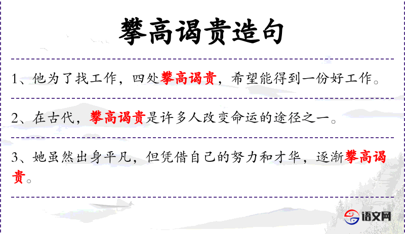- 攀高谒贵:在**文化中,这通常指通过社交活动提升自己的社会地位。