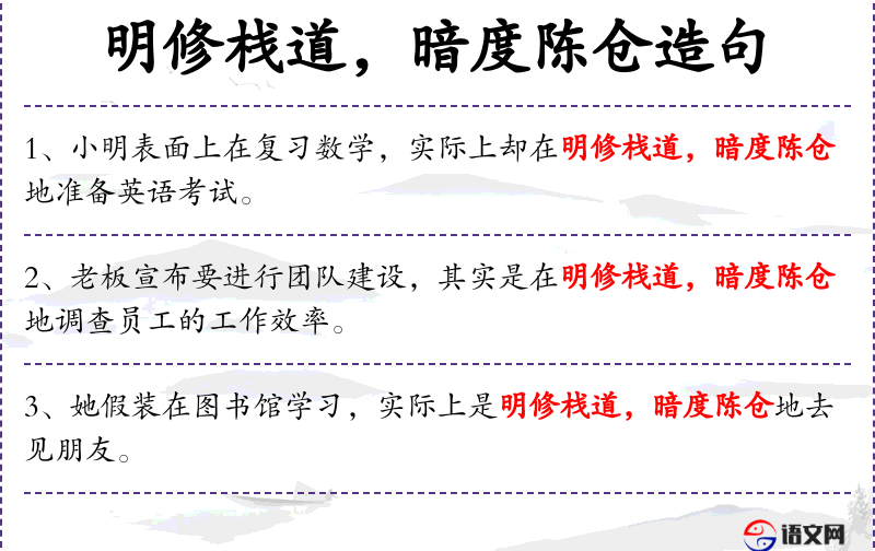- 明修栈道,暗度陈仓:成语,比喻用明显的行动迷惑对方,暗中进行别的活动。 *. 检查:查看,核实。