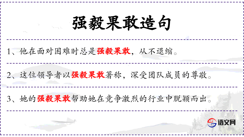 - 强毅果敢:形容词短语,表示坚强、果断、勇敢。
