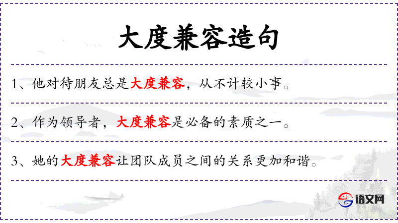 - 大度兼容:指一个人能够包容不同的意见和个性,不轻易发怒或表现出狭隘的态度。