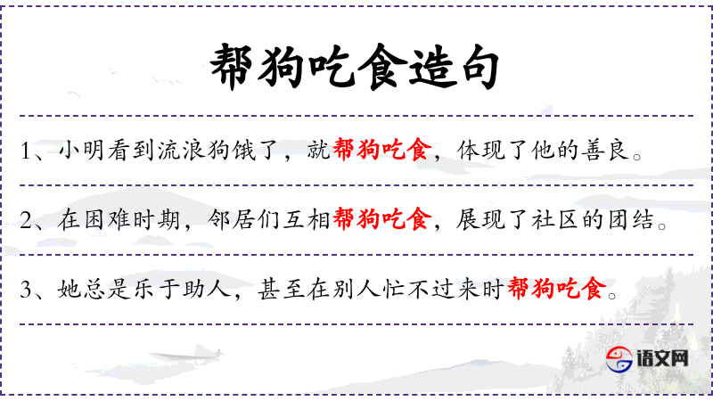 - 帮狗吃食:这个表达较为特殊,通常“帮狗吃食”在中文里不是一个常见的成语或短语,可能是一个比喻或打字错误,正常表达应为“帮助彼此”。