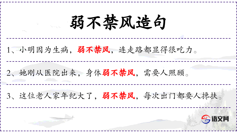 - 弱不禁风:成语,形容身体非常虚弱,经不起风吹。