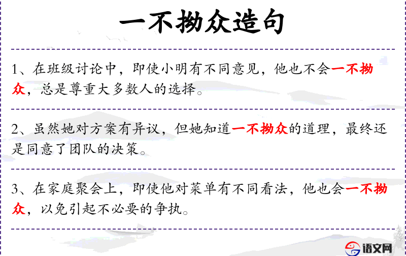 - 使用“一不拗众”体现了礼貌和团队合作的态度,隐含了对集体意见的尊重。