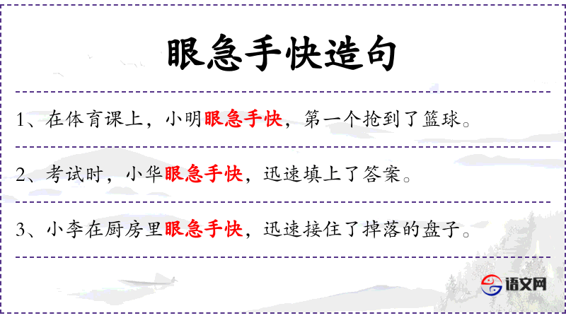 7. 【眼急手快】 形容做事机警敏捷。