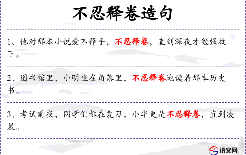 释:放开;卷:书本。书本不离手。形容勤奋好学。