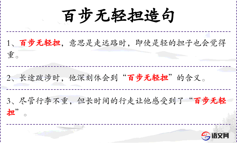 1. 【百步无轻担】 - 百步:指长途。跑长路,担子再轻也感到很沉重。比喻道远而任重。