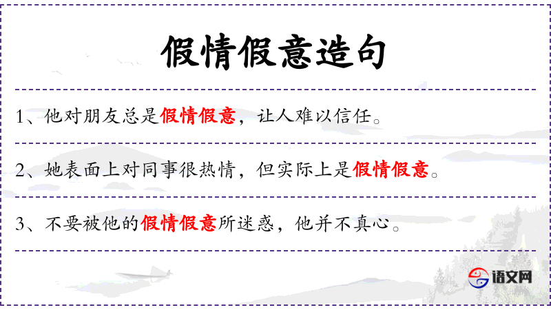 - 假情假意:这个成语在**文化中常用来形容人的虚伪和不真诚。