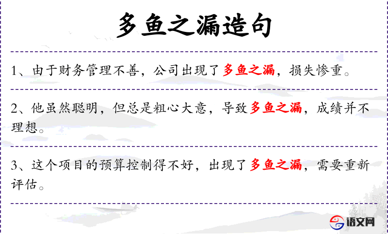 - 多鱼之漏:比喻工作中的疏漏或失误。