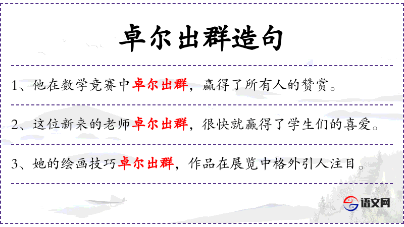 句子中的“卓尔出群”是一个中文成语,源自《左传·宣公十五年》:“卓尔不群”,意为超出一般,非常杰出。这个成语在**文化中常用来形容人的才能或成就非常突出。