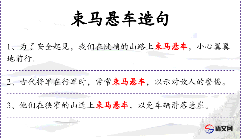 4. 【束马悬车】 束马:把马蹄包起,防止马滑倒;悬车:把车子钩牢,以防脱落。把马脚裹起来,把车吊上山去。形容走山路的艰险情况。