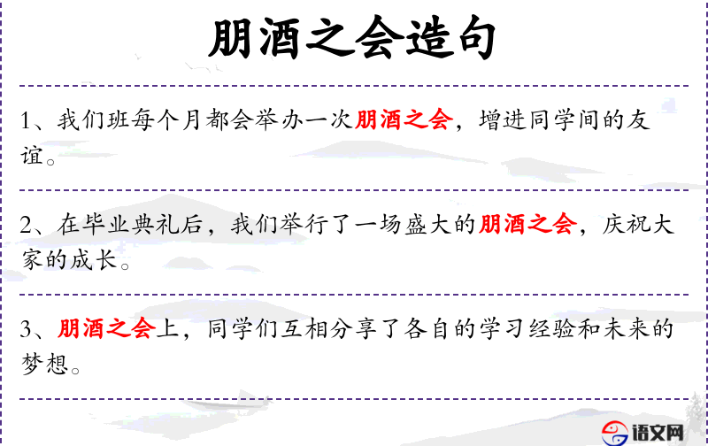 1. 【朋酒之会】 - 朋酒:朋友聚会畅饮。朋友欢饮的聚会。