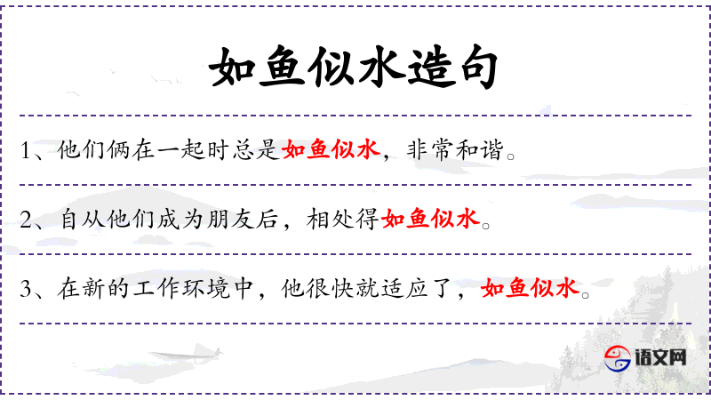 - 如鱼得水:成语,比喻处于非常适应的环境或状态。