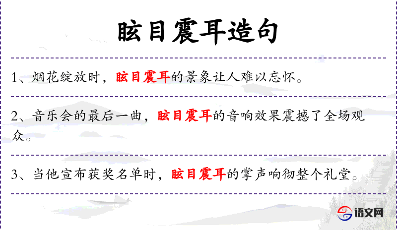 4. 【眩目震耳】 - 眩:眼花,迷乱;眩目:耀眼。形容色彩繁多使人眼花,声音巨大震耳欲聋。