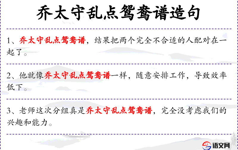 句子中“乔太守乱点鸳鸯谱”是一个成语,源自古典小说,用来比喻不合理的安排或配对。这个成语体现了文化中对合理安排和有序管理的重视。