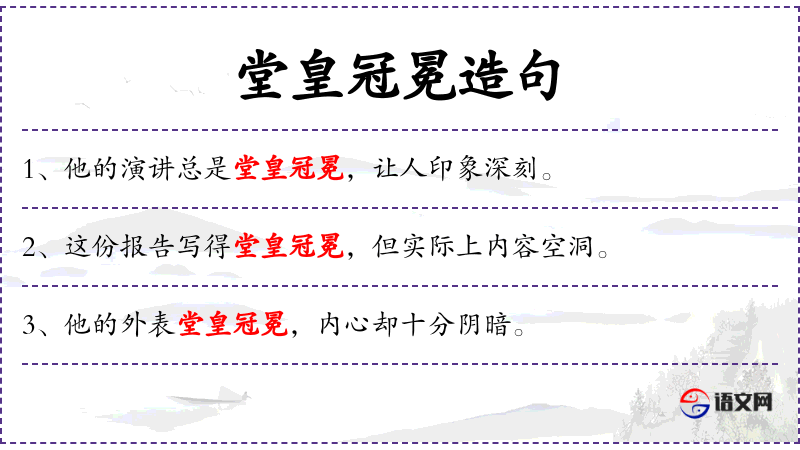 言辞堂皇冠冕:形容说话非常正式、庄重,但可能含有虚假或夸大的成分