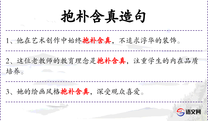 - 抱朴含真:形容词短语,意指保持朴素和真诚。