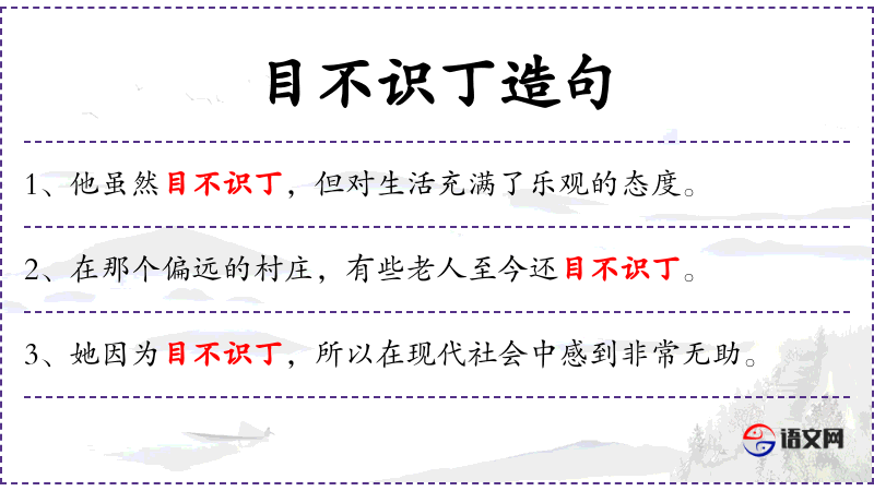 5. 【目不识丁】 连最普通的“丁”字也不认识。形容一个字也不认得。