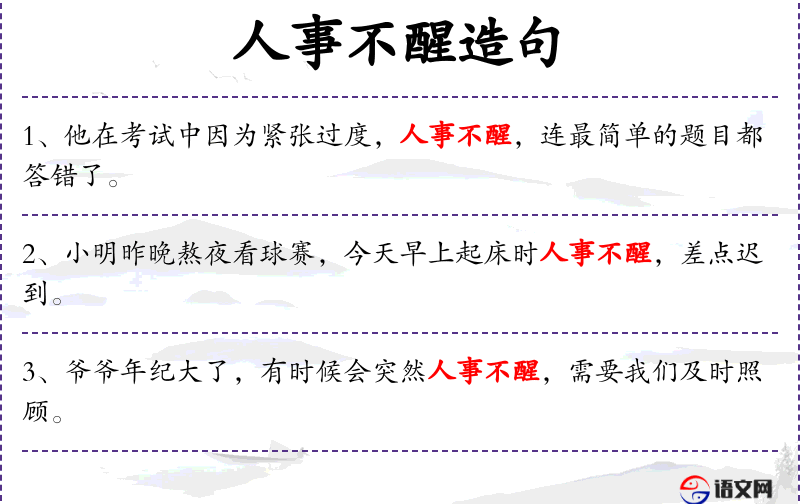 - 人事不醒:成语,形容人极度震惊或昏迷,无法清醒。