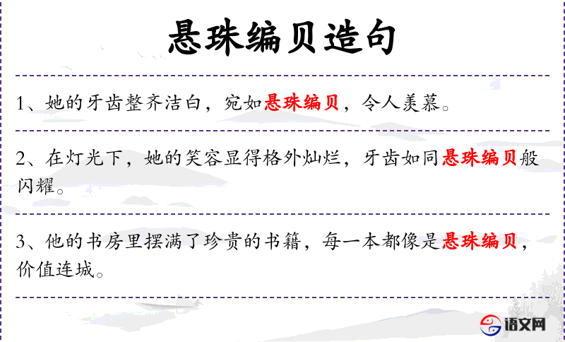 - 悬珠编贝:这个比喻可能源自古代对美的描述,珍珠和贝壳在文化中常被视为美丽和珍贵的象征。