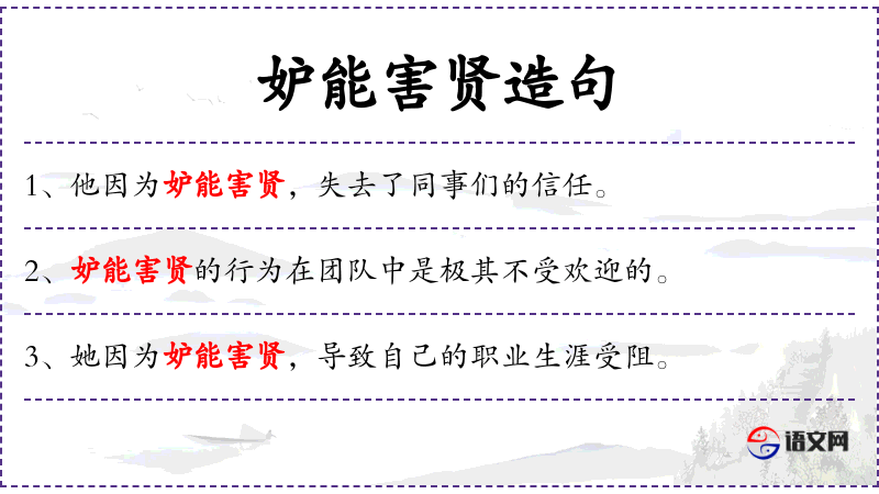 - 妒能害贤:这个成语反映了**传统文化中对嫉妒行为的负面评价。