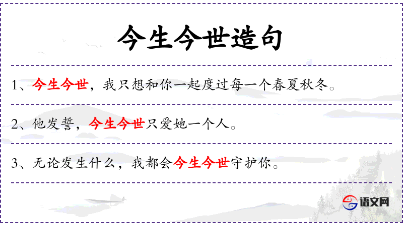 - 今生今世:表示从现在起到生命的结束,强调时间的连续性和不可逆性。