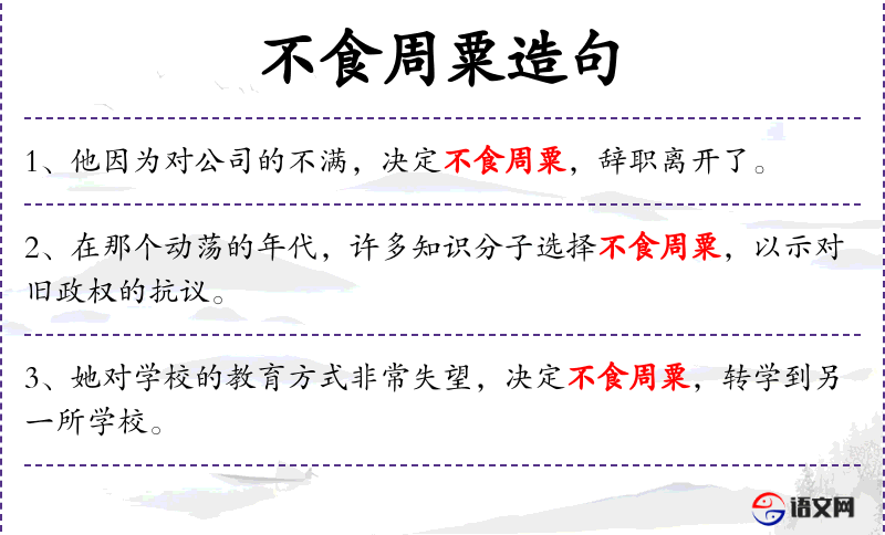 1. 【不食周粟】 - 粟:小米,泛指粮食。本指伯夷、叔齐于商亡后不吃周粟而死。比喻忠诚坚定,不因生计艰难而为敌方工作。