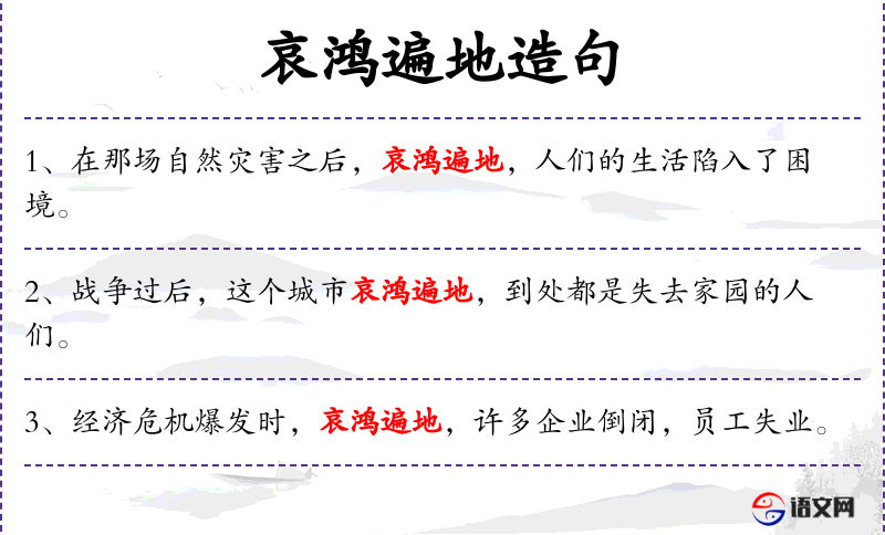 - 哀鸿遍地:比喻灾难中人们悲惨无助的情景。