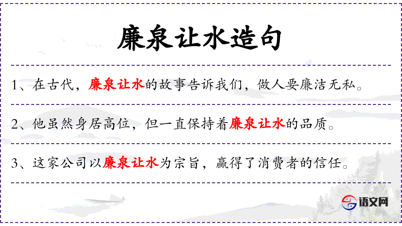- 廉泉让水:成语,比喻廉洁自律,不贪不占。