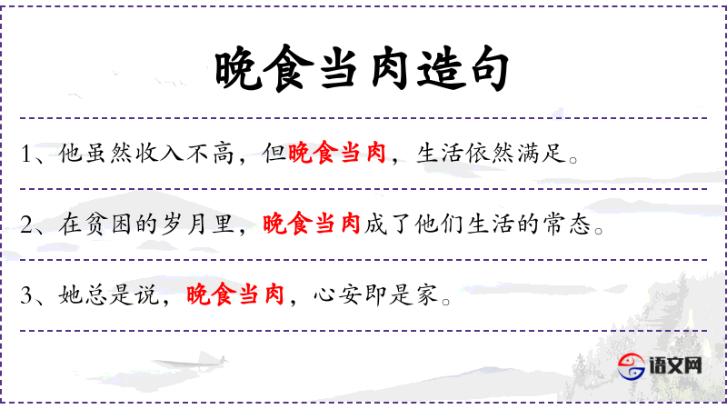 3. 【晚食当肉】 饿了再吃,味道就象吃肉一样。后泛指不热衷名利。