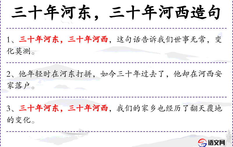 句子:“他年轻时在河东打拼,如今三十年过去了,他却在河西安家落户。”