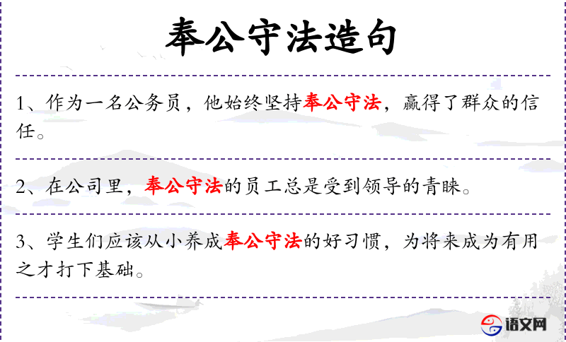 - 奉公守法:成语,意思是遵守法律,忠于职守。