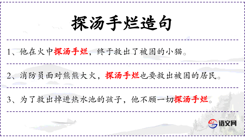 句子中“探汤手烂”是一个比喻,源自古代的成语“探汤手烂”,原意是指把手伸进滚烫的水中,手会被烫烂。这里用来形容消防员面临的极端危险情况。这个成语体现了文化中对勇敢和牺牲精神的赞美。