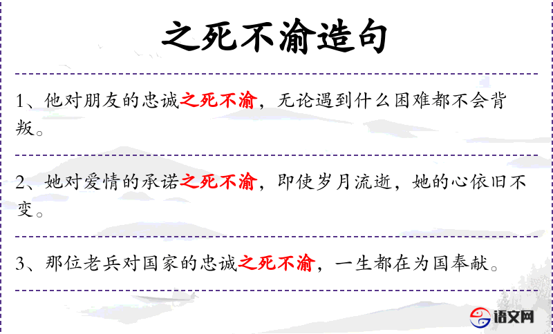 - 句子中“死不渝”是一个成语,源自传统文化,表示坚定不移的承诺。这种表达在文化中常用于强调忠诚和坚定。