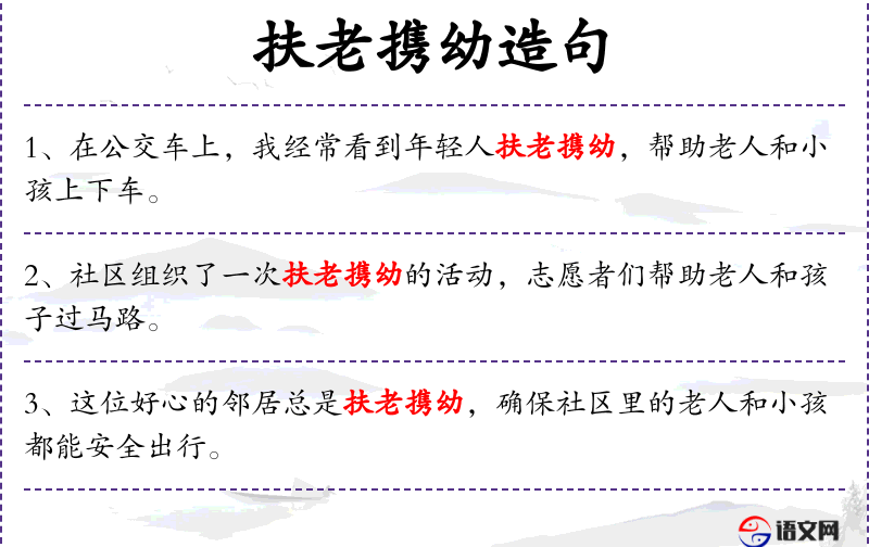 - 扶老携幼:成语,意思是帮助老人和小孩,体现尊老爱幼的传统美德。