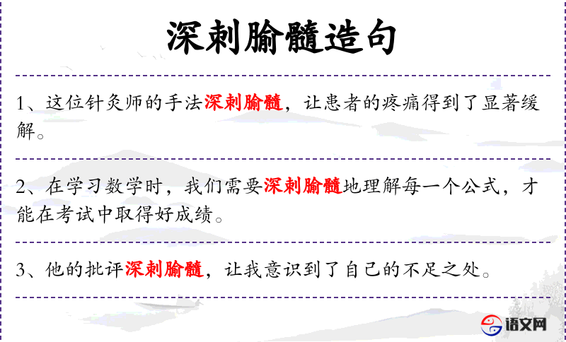 5. 【深刺腧髓】 穿穴入骨。形容深透理解。腧,穴位。
